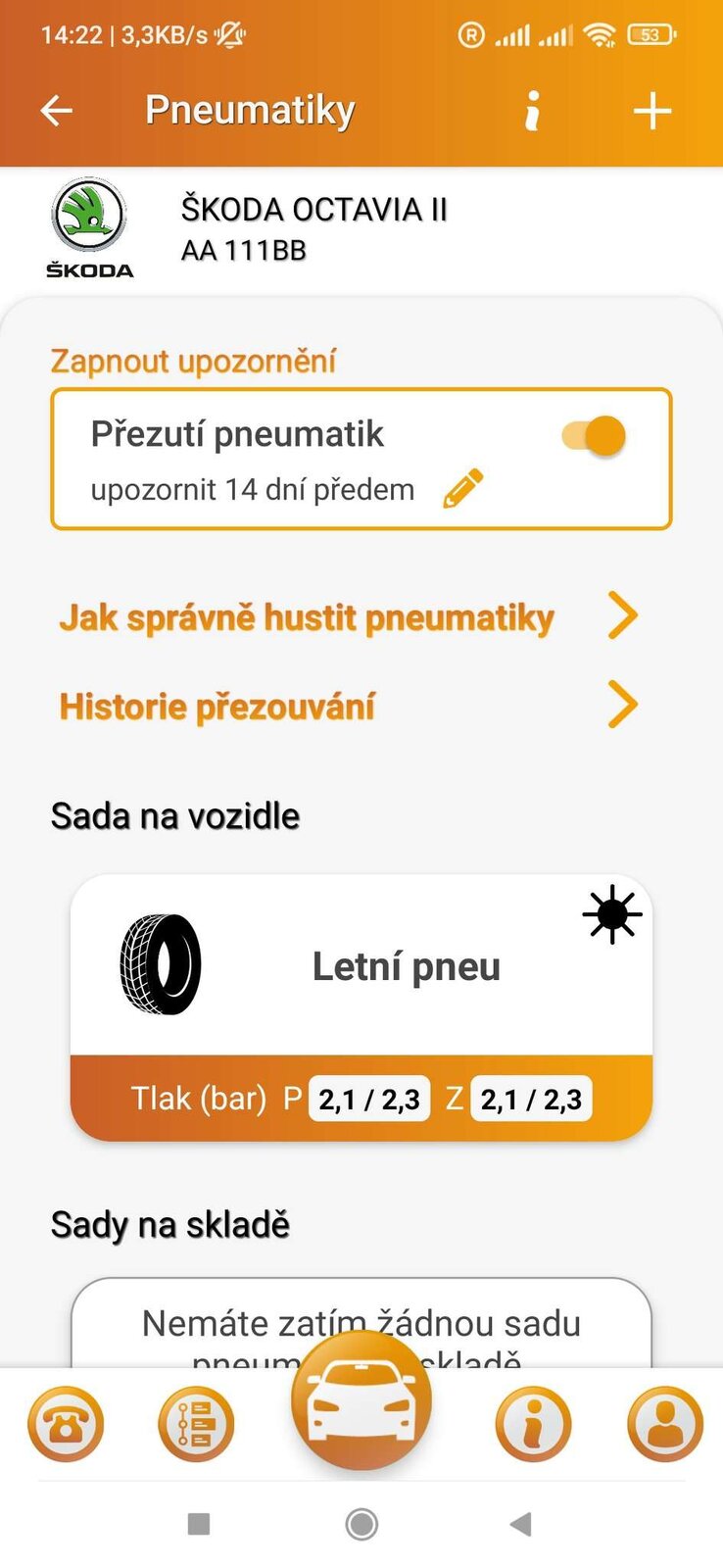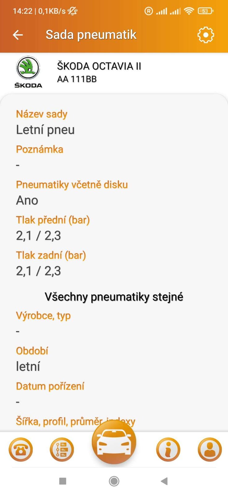 Zadejte si do aplikace doporučený tlak u každé ze sad pneumatik k Vašemu vozidlu a mějte tyto hodnoty vždy po ruce. Bude se Vám to hodit v při výměně sezonních sad pneumatik.