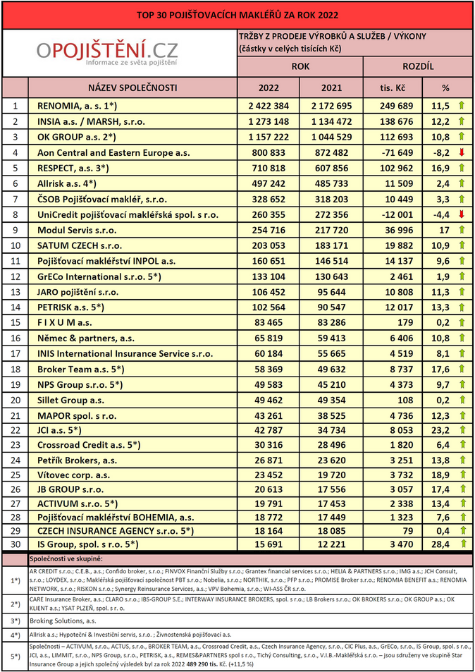 V aktuálním žebříčku TOP 30 byla hranice 100 milionů korun překonána hned čtrnáctkrát a přes magický výsledek jedné miliardy korun se dostaly tři společnosti. Vítězná RENOMIA rostla v tržbách o 11,5 %, díky čemuž se dokonce blíží 2,5miliardové hranici. Společný výsledek společností INSIA a MARSH dosáhl na druhém místě hodnoty 1 273 148 tis. Kč, z čehož samotná INSIA překonala miliardovou hranici poprvé ve své historii, celkově to pak představuje velmi solidní 12% růst. Pomyslnou bronzovou medaili pak získala společnost OK GROUP. Její tržby v roce 2022 dosáhly 1 157 222 tis. Kč, to ve výsledku znamená 10% zlepšení.
